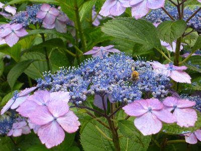もうどこかへ飛び去ってしまったミツバチに「おどかしたなぁ、ごめんよ~」とあやまると、「私にとってもミツバチがくることは大切なこと」という声が聞えてきました。目の前のアジサイの声でした。