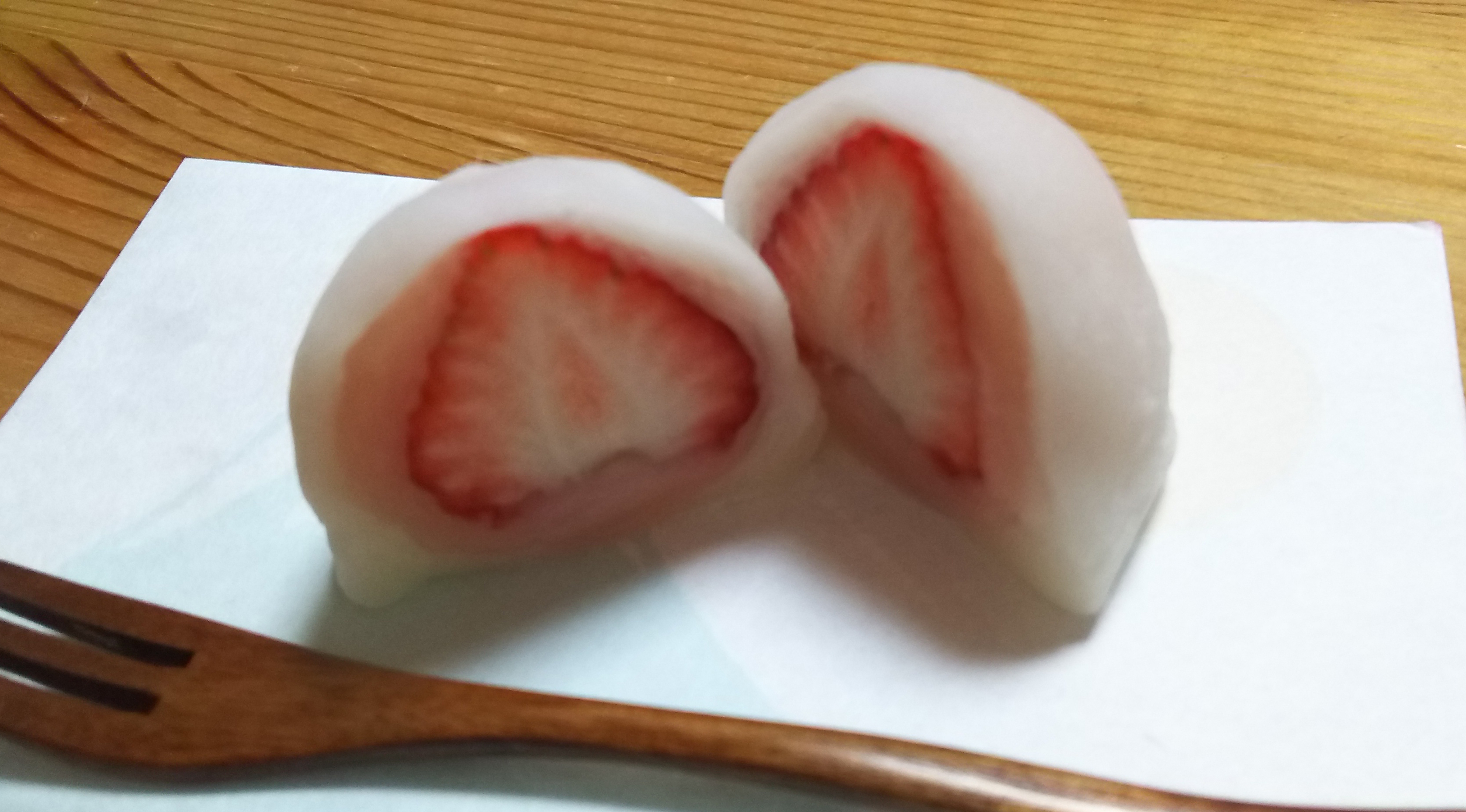 ~今日の和菓子・イチゴ大福(白餡!)。撮影センスがなくて画像が白い!^w^~