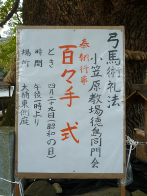 さて、明日、4月29日の午後1時~、大麻比古神社で百々手式(ももてしき)が奉納されるそうです
